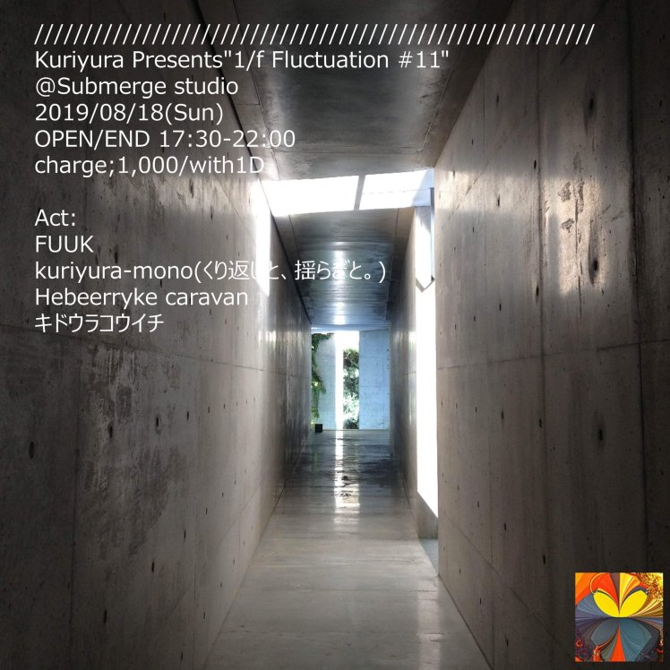 Kuriyura Presents”1/f Fluctuation #11″ @Submerge studio 2019/08/18(Sun) OPEN/END 17:30-22:00 charge;1,000/with1D Act: FUUK kuriyura-mono(くり返しと、揺らぎと。) Hebeerryke caravan キドウラコウイチ 投稿日: 2019年8月2日2019年8月2日 投稿者: neo.material.films@gmail.com 8月18日(日) 共有: X で共有 (新しいウィンドウで開きます) X Facebook で共有 (新しいウィンドウで開きます) Facebook いいね 読み込み中…